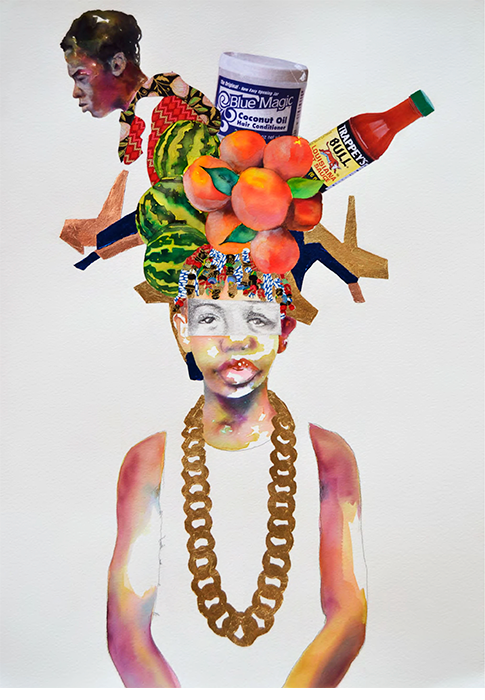 Mixed media (watercolor, flashe, graphite, gold leaf, collage paper) on paper.