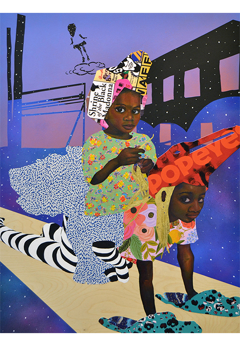 Mixed media (flashe, oil, acrylic, gold leaf, aerosol, collage paper) on wood panel.